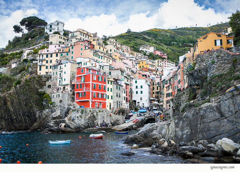 Puis direction les « Cinque Terre », toujours dans la région de « Liguria », on s’arrête à Levanto où nous trouvons un Camping « Aqua Dolce », nous plantons la tente sur les terrasses d’oliviers. Tout le littoral pour arriver jusqu’ici a été une succession de tunnel, le relief est bien montagneux, des pentes d’olivier ou de vignes, de rochers viennent plonger dans la mer. Après un petit tour en vélo, pour la découverte du littoral, nous avons pris le train qui facilite le ralliement des villages des « cinque terre », connus par leurs couleurs et leurs constructions « suspendus, accrochés » sur les falaises.